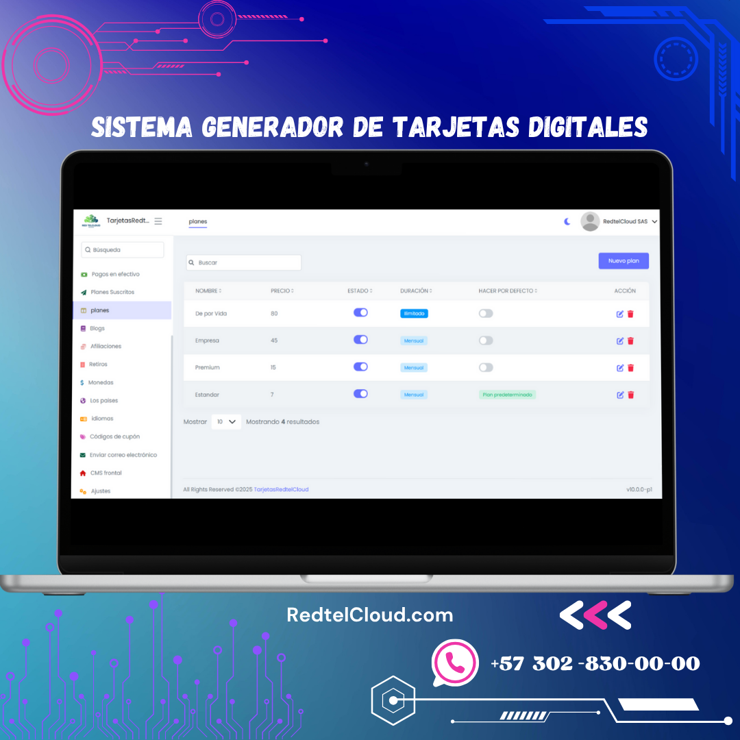 Desde esta sección, el administrador puede crear diferentes planes de suscripción según sus necesidades, seleccionando las plantillas y estableciendo precios, monedas y características específicas de TarjetasRed.