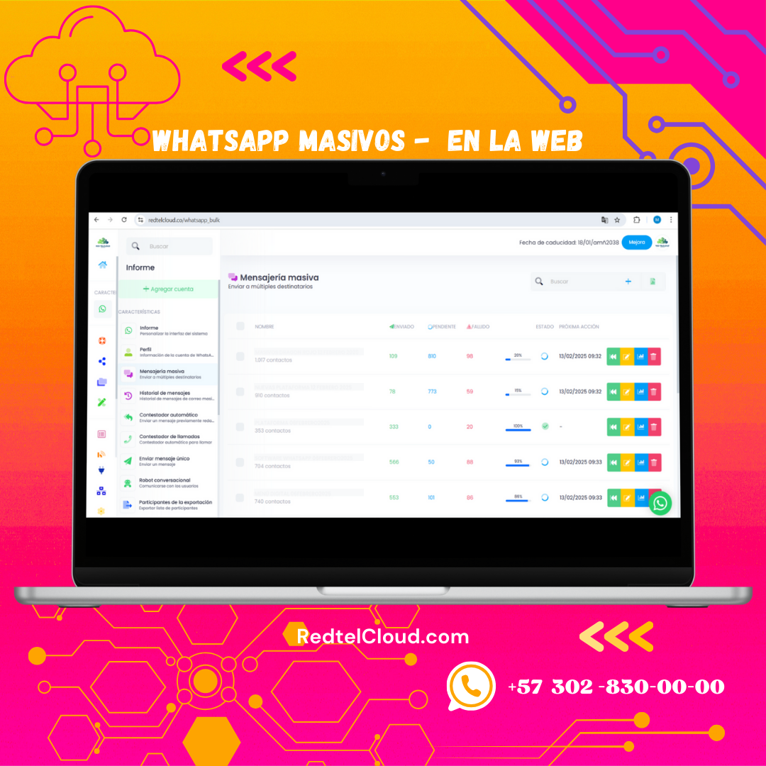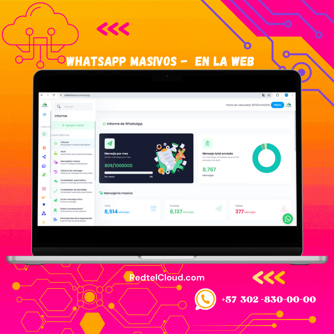 RedTelCloud es una plataforma de mensajería masiva por WhatsApp que automatiza y personaliza mensajes, optimizando campañas y mejorando la atención al cliente.